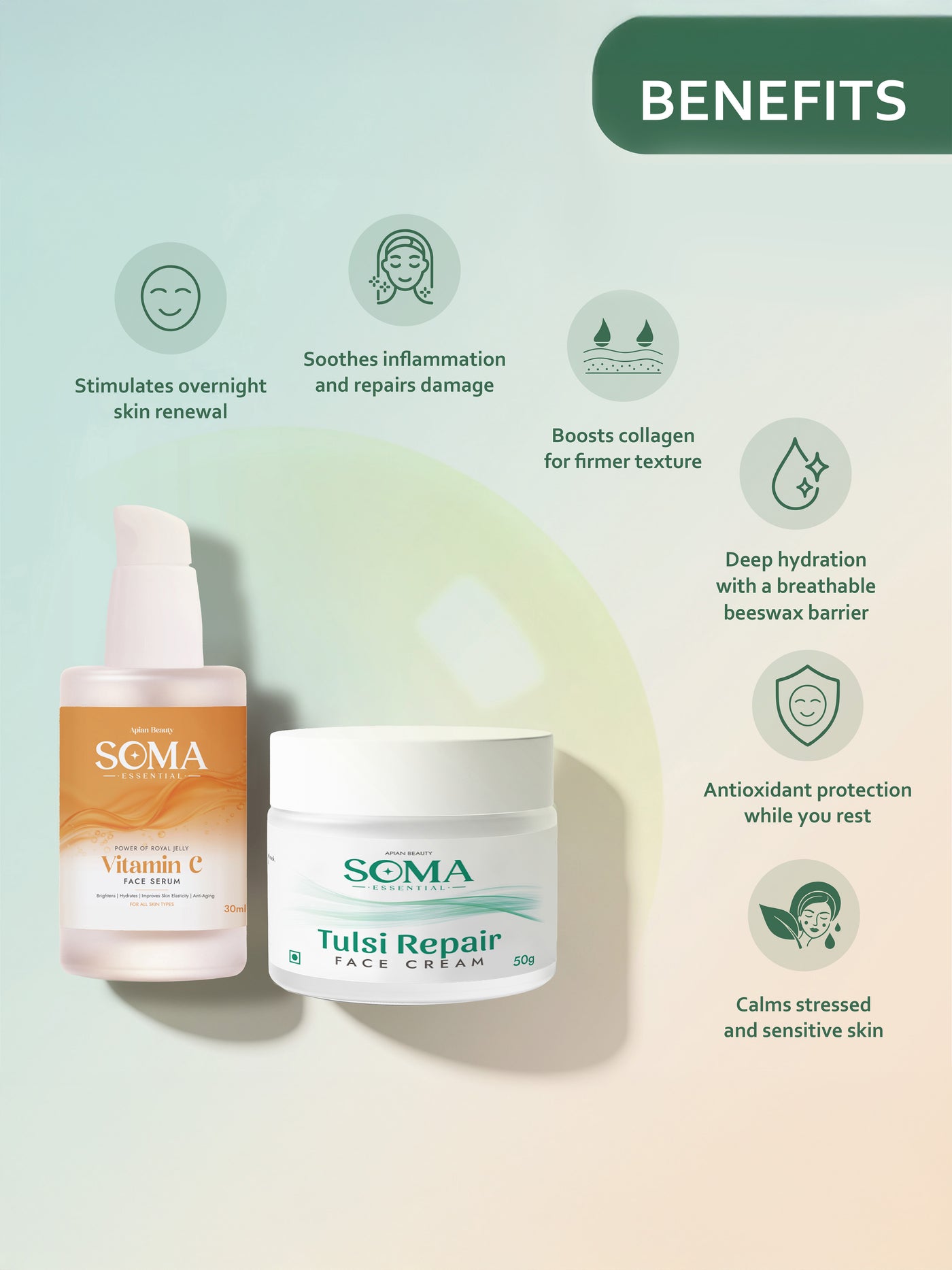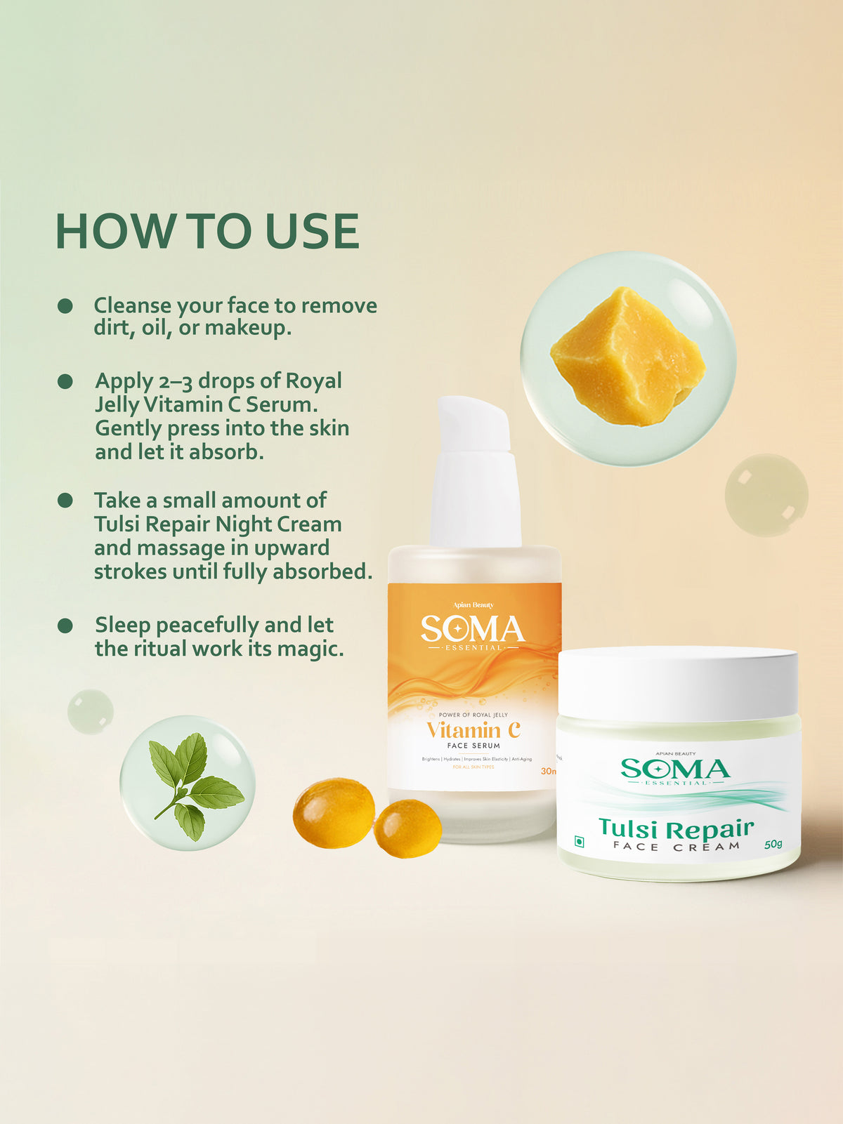 Unwind into the wisdom of the night with Soma Essential’s Night Calm Ritual—a serene blend of Royal Jelly Vitamin C Serum and Tulsi Repair Night Cream. This duo works in harmony with your body’s natural rhythm, calming, repairing, and renewing the skin as you sleep.